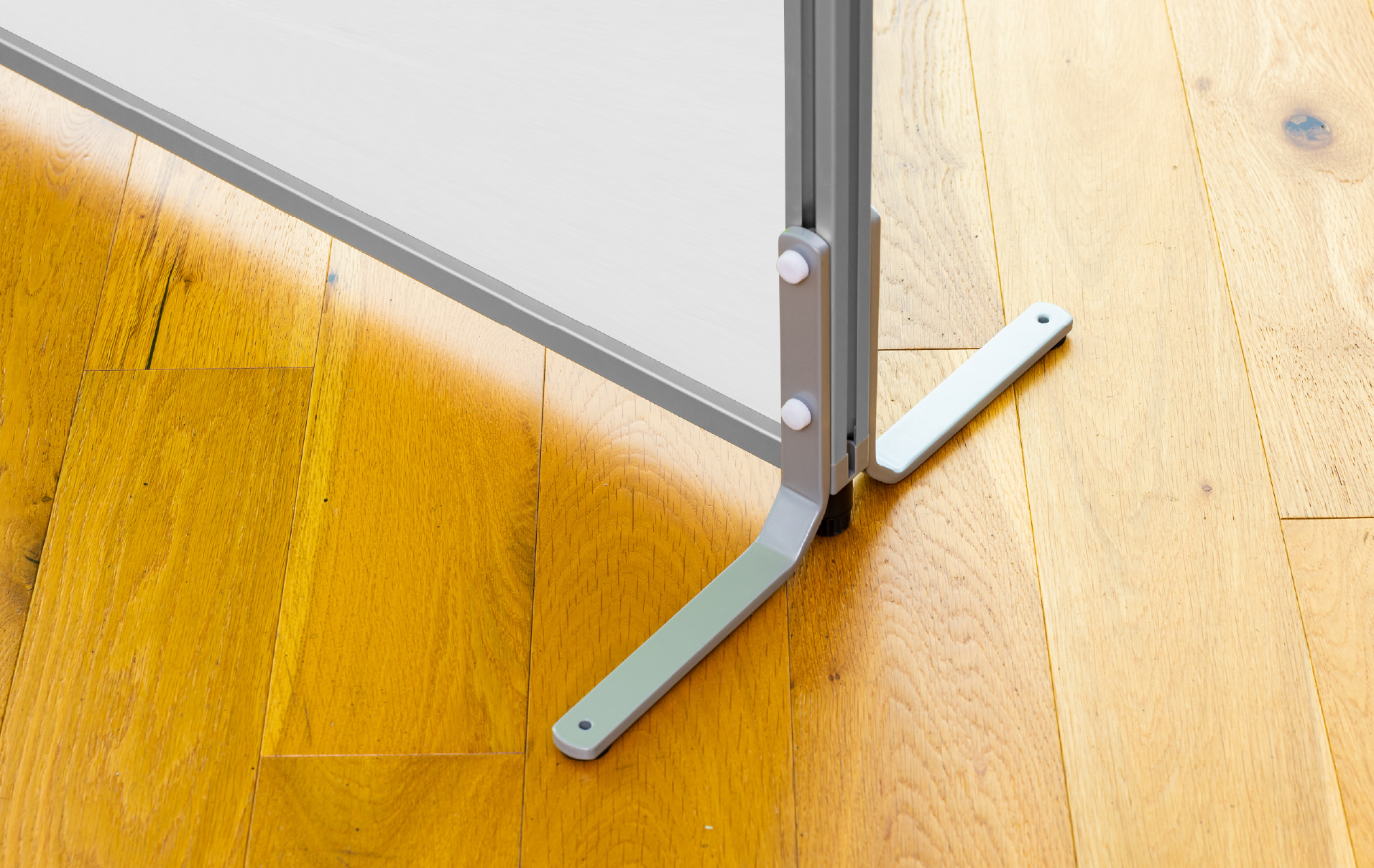 より安全で安定した状態で使用するために「安定脚」というオプションパーツを販売しています。パーテーションの足元にしっかりと固定することで、グラつきや転倒を防止します。人や物がぶつかっても倒れにくくなり、安心して使用できます。