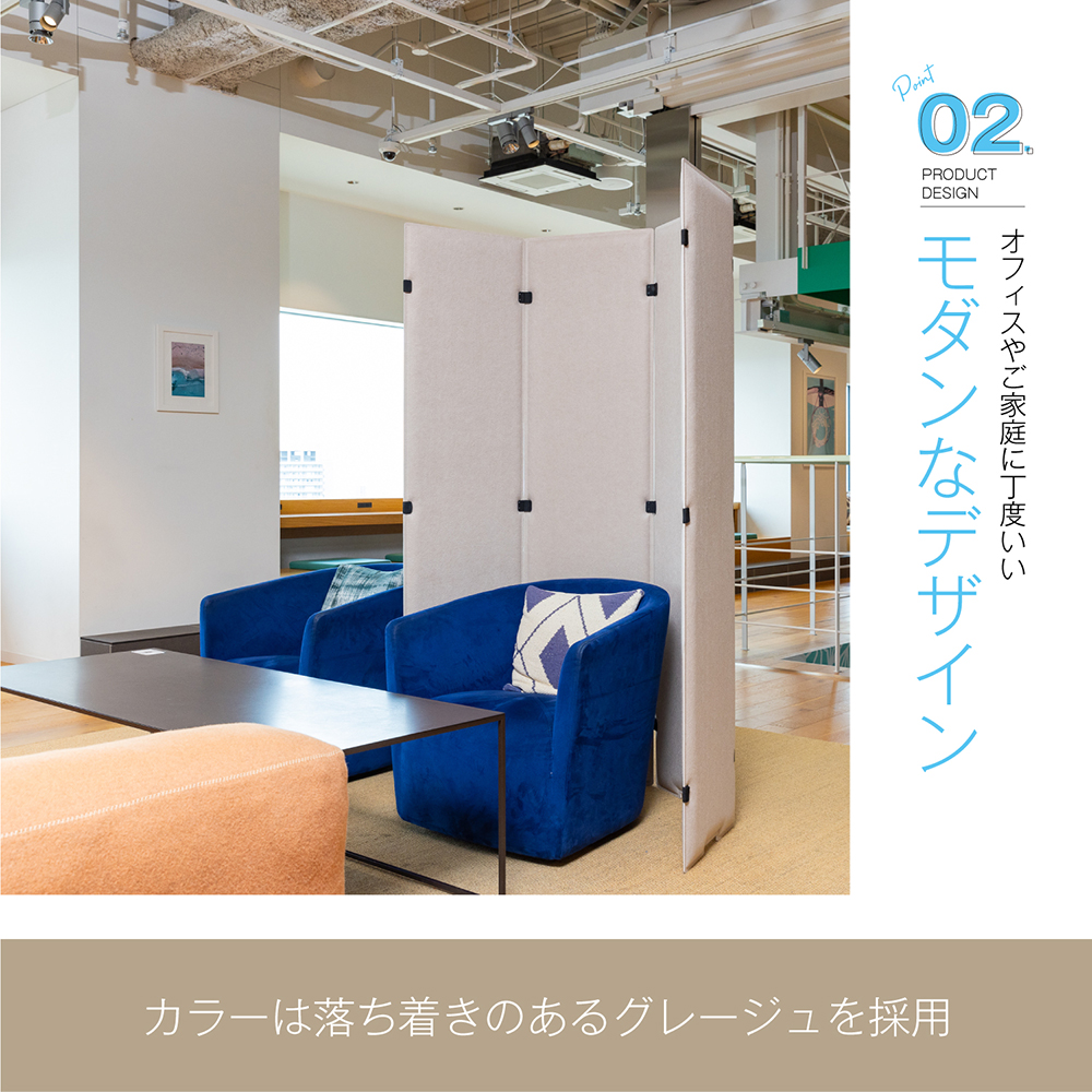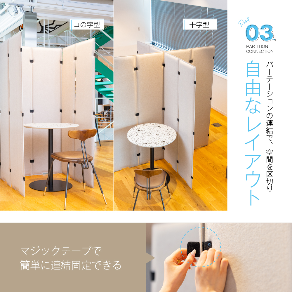 フェル素材のカジュアルなパーテーション。自由に連結できるのでレイアウトしやすいのが特徴です。吸音素材を使用しているためオフィスはもちろんご自宅でも使いやすい商品です。