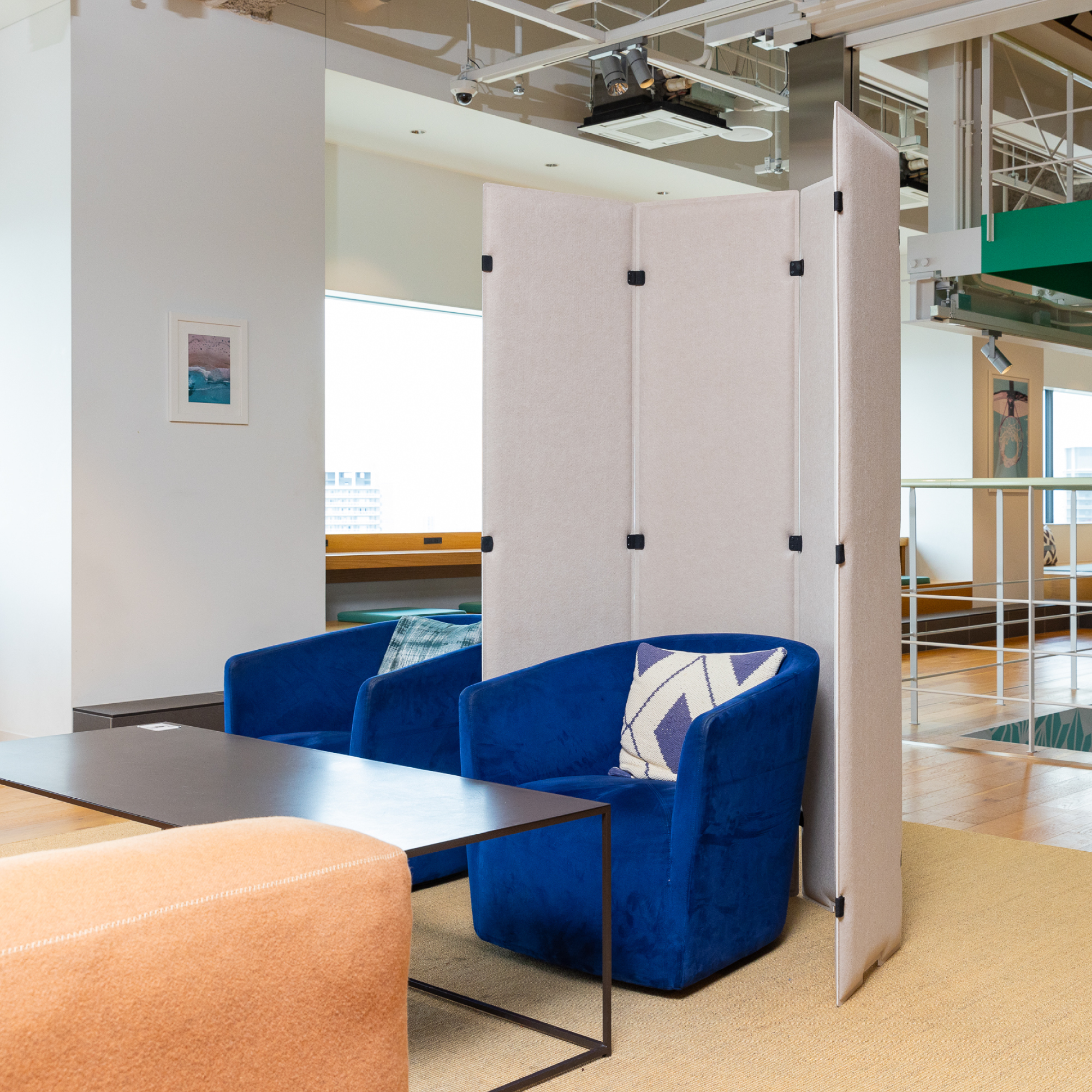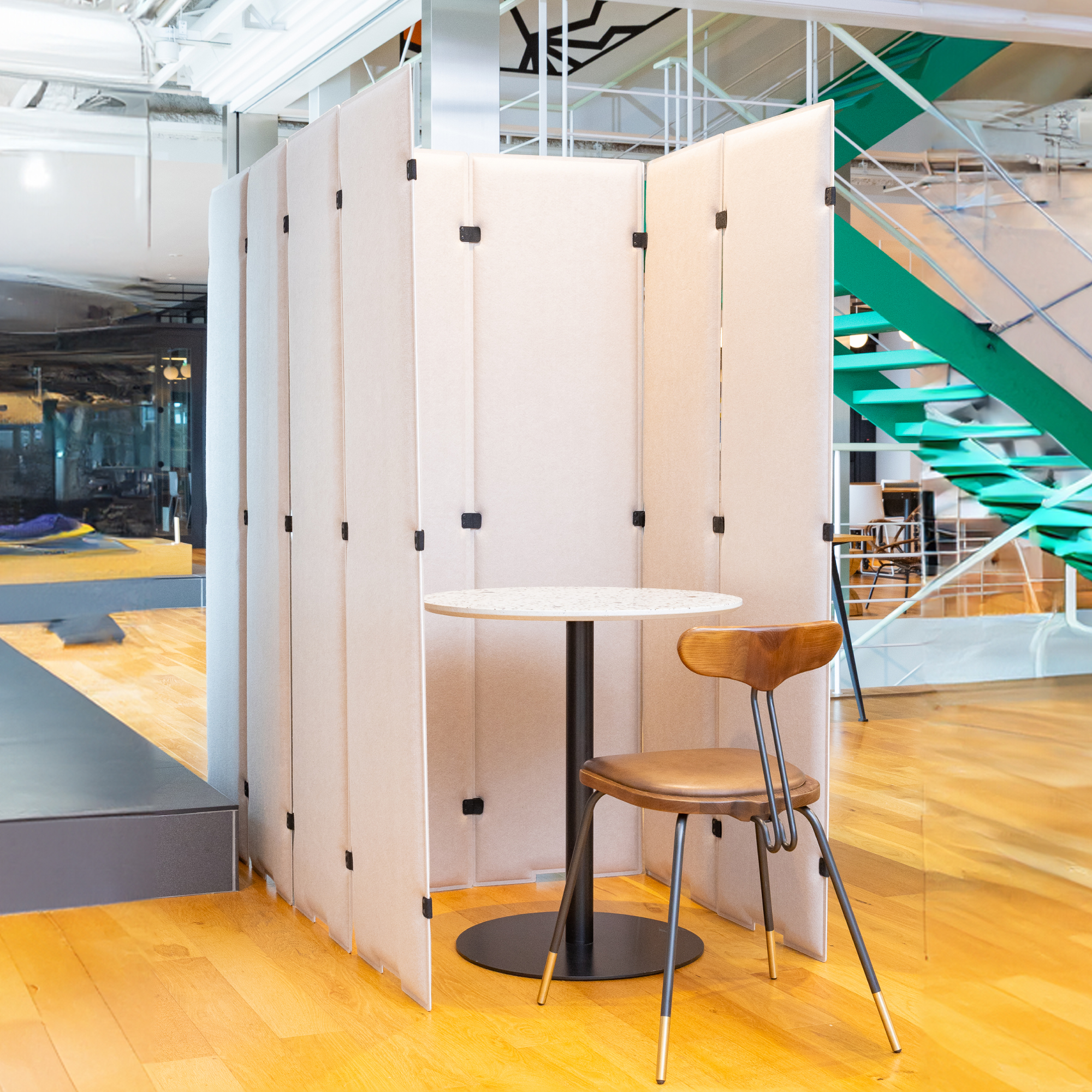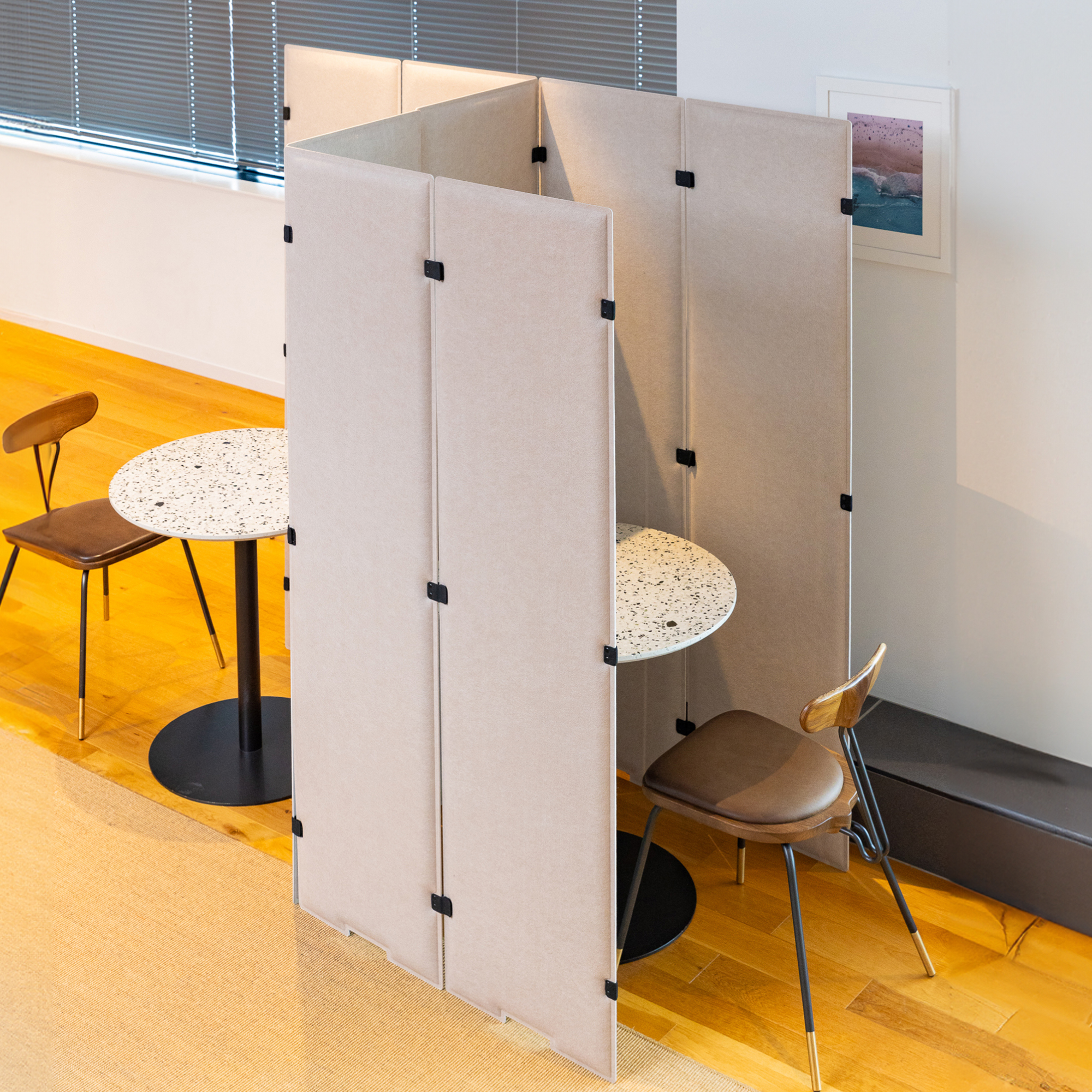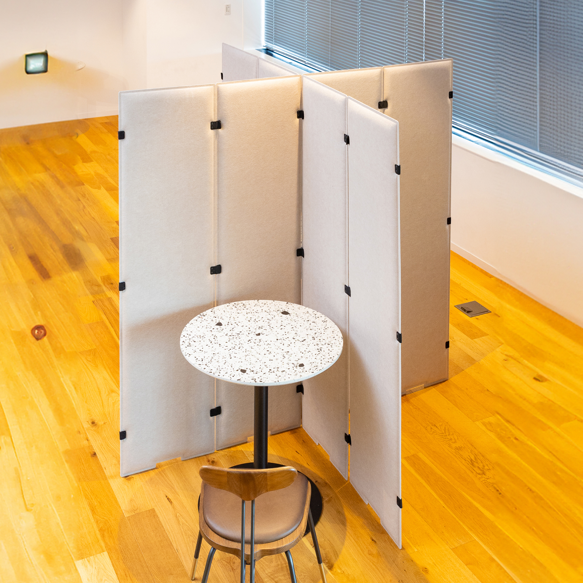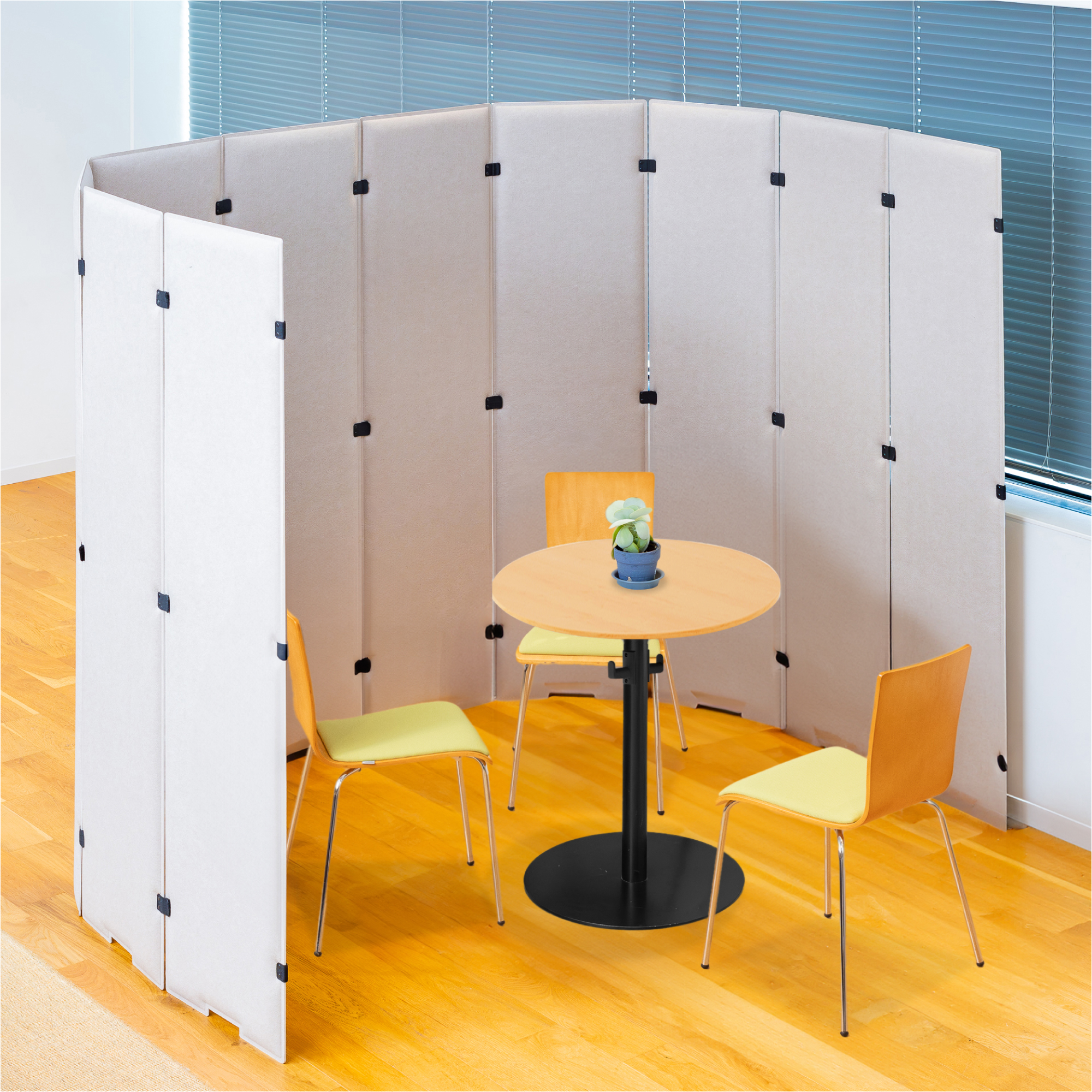 フェル素材のカジュアルなパーテーション。自由に連結できるのでレイアウトしやすいのが特徴です。吸音素材を使用しているためオフィスはもちろんご自宅でも使いやすい商品です。