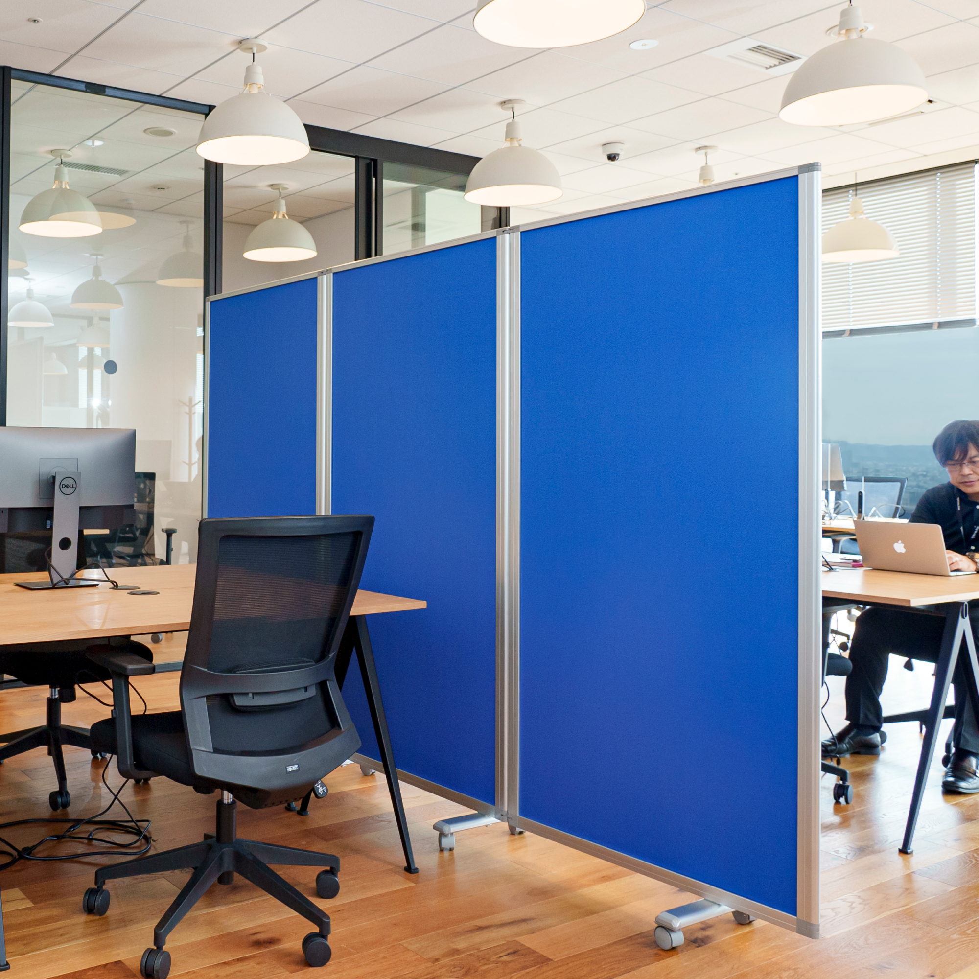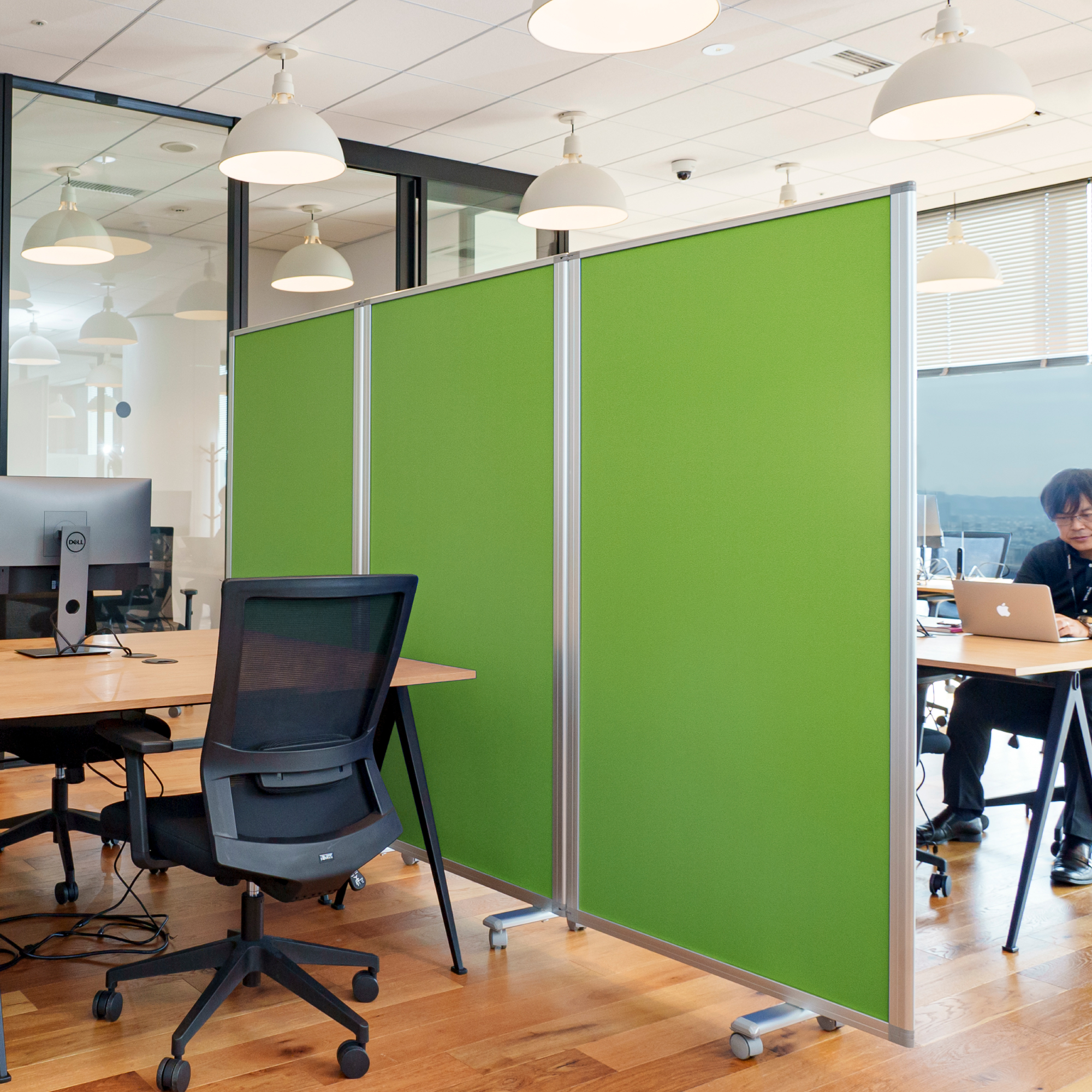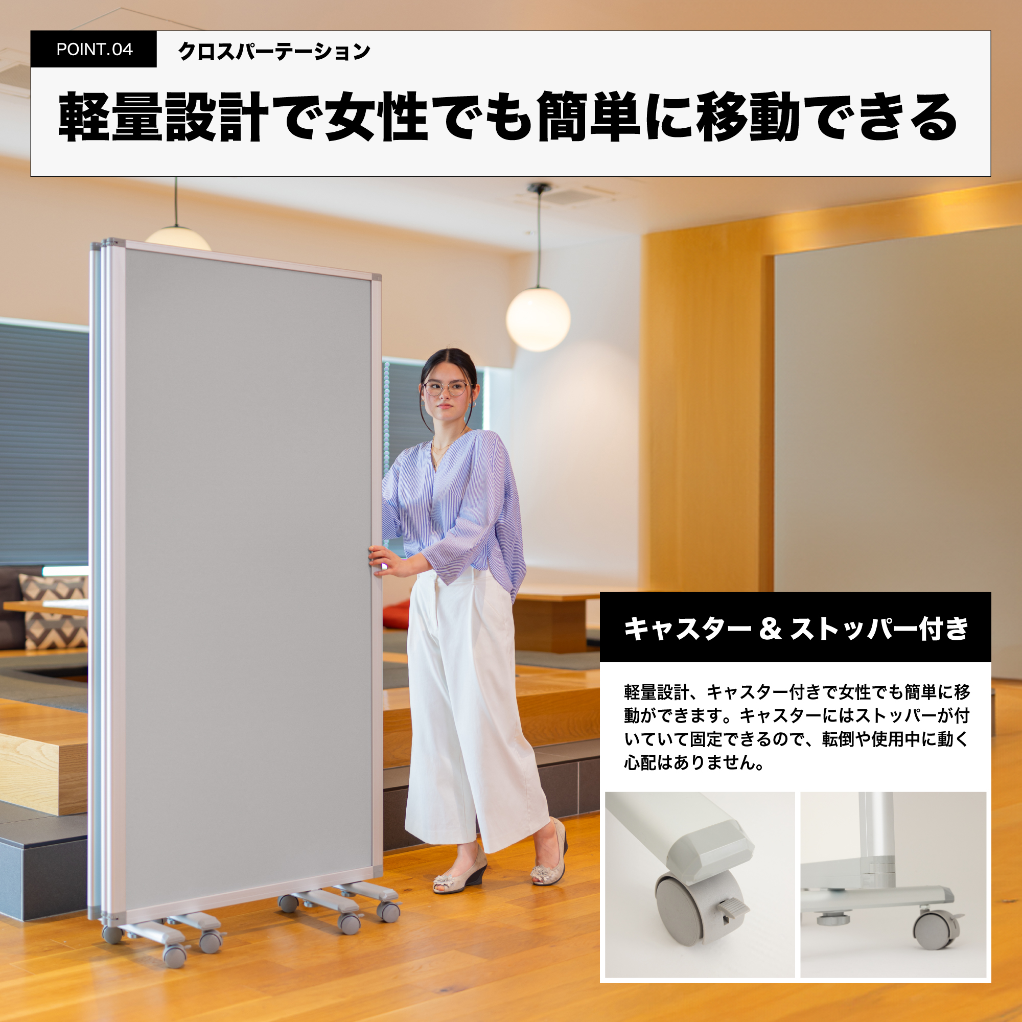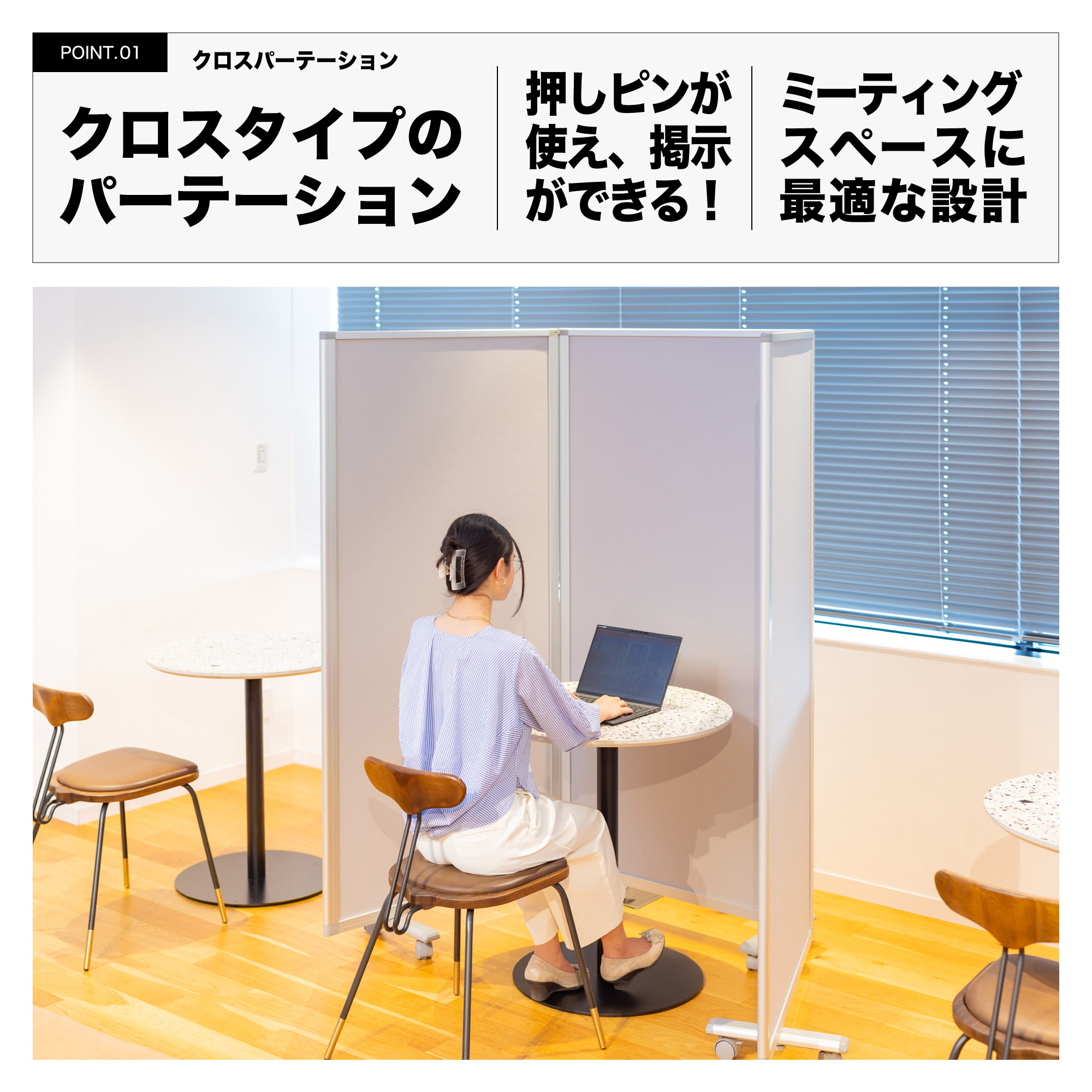 押しピンが使える。明るい色調のクロスタイプのパーテーション。ぴったりたためて省スペースで収納できます。キャスター付きで、移動がラク。