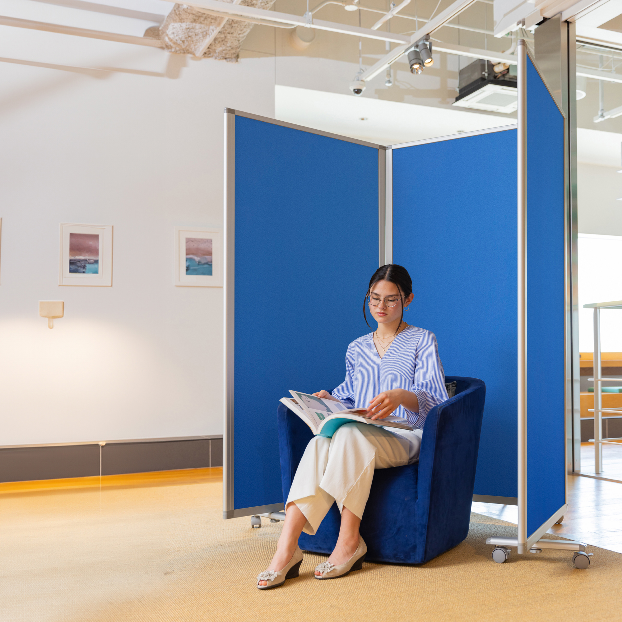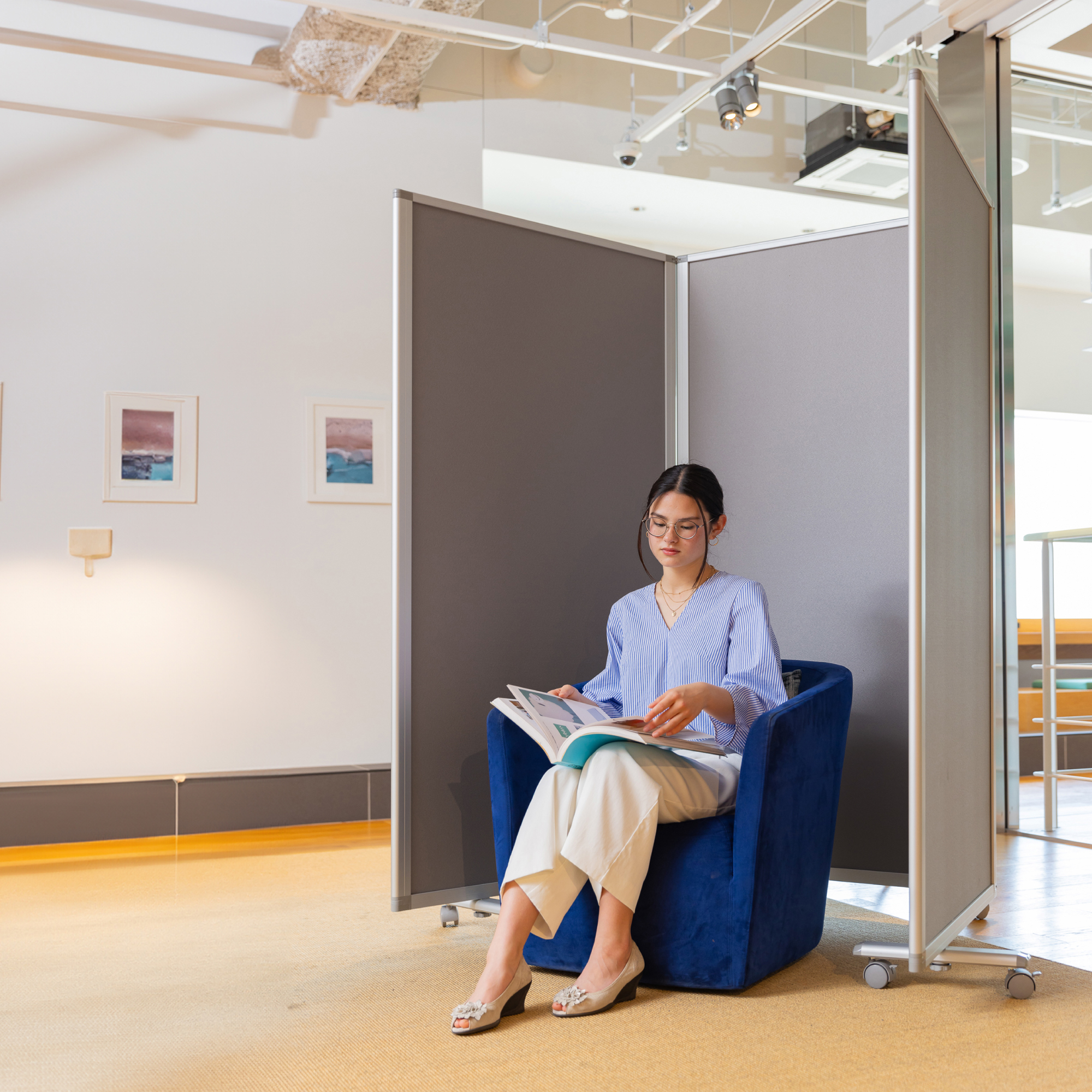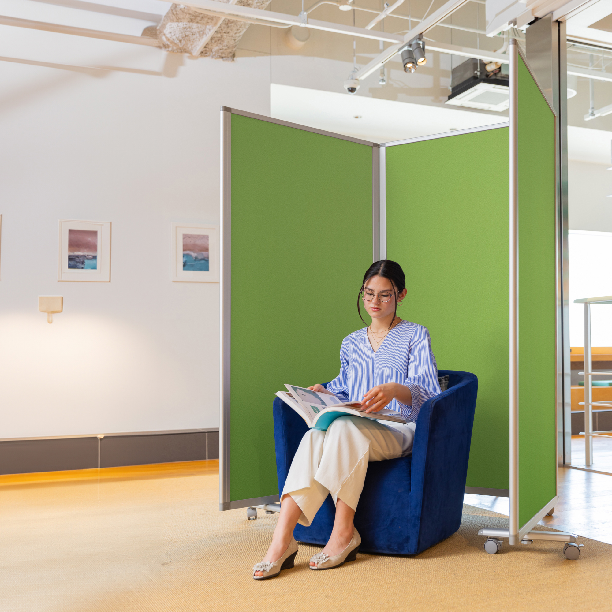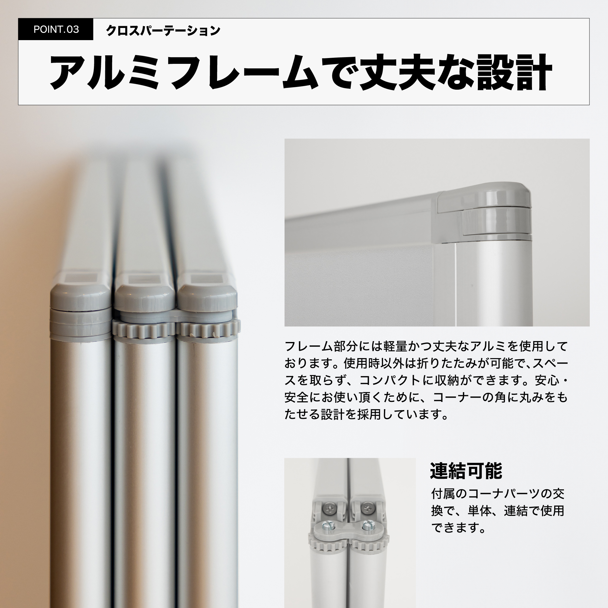 押しピンが使える。明るい色調のクロスタイプのパーテーション。ぴったりたためて省スペースで収納できます。キャスター付きで、移動がラク。